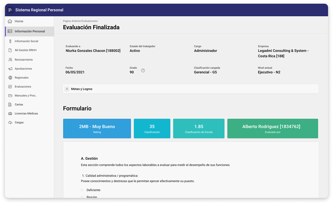 Acceda al historial completo de evaluaciones de cada colaborador con un solo clic, visualizando su trayectoria, tendencias y oportunidades de desarrollo a través del tiempo.